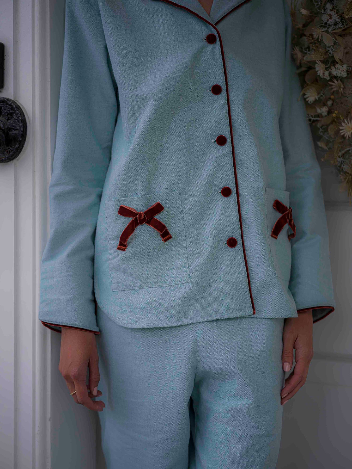 These luxury brushed cotton pyjamas with velvet bows are the most wonderful gift in collaboration with renowned artist Gail Jones and come complete with a matching Bow Card. The cotton is beautifully soft and feels such a treat and so special on.