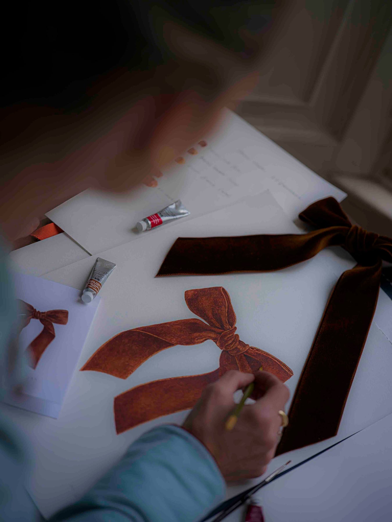 Based locally to one another in Buckinghamshire and Oxfordshire; Siân and Gail first bonded at an International Women’s Day event. Supporting each other through their creative ventures, at pop-ups and local events, it was the perfect synergy for a collaboration. Last Christmas the seed was sown for Sian to build on her love of velvet and bows. With our velvet piping and bowed bed socks, I knew a bow pyjama would be next! Gail has always painted the most exquisite velvet bows and so we have partnered to create a very special gift to include a pair of bow pyjamas and matching bow greetings card.